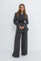 Комплект 2-х предметный из хлопковой ткани, состоит из жакета и и брюк. Жакет женский удлиненный, полуприлегающего силуэта с центральной бортовой застежкой на пуговицы до линии перегиба лацкана. Спереди рельефные швы от плечевого шва, отрезной бочок и карман с клапаном. Спинка с рельефами от плечевого шва. Рукав втачной, двухшовный, 3/4, с небольшим разрезом в локтевом шве. Воротник пиджачного типа. Перед жакета на подкладке. Длина рукава 50, длина по спинке 68 см. Классические брюки, прямые, слегка заужены к низу,заутюжены стрелки,по переду обработаны карманы с отрезным бочком,застежка на тесьму-молнию и 1 пуговицу.На задних половинках обработаны вытачки и имитация карманов в рамку с двумя обтачками,пояс в брюках притачной. По низу брюк в боковом шве есть небольшой разрез. Длина брюк от талии по боковому шву 93 см.