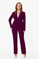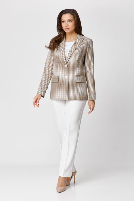 Комплект женский-двойка, из текстильной ткани, жакет удлиненный, полуприлегающего силуэта с центральной бортовой застежкой на пуговицы до линии перегиба лацкана. Спереди рельефные швы от плечевого шва, отрезной бочок и карман с клапаном. Спинка с рельефами от плечевого шва. Рукав втачной, двухшовный. Воротник пиджачного типа. Жакет на подкладке, длина по спинке 67 см, длина рукава 62 см. Брюки прямые, классические, с заутюженными стрелками, по переду обработаны карманы с отрезным бочком, застежка на тесьму-молнию и 1 пуговицу. На задних половинках обработаны вытачки и имитация карманов с листочкой, пояс в брюках притачной. Длина брюк от талии по боковому шву 103 см. Рекомендуем к комплекту блузу 479.