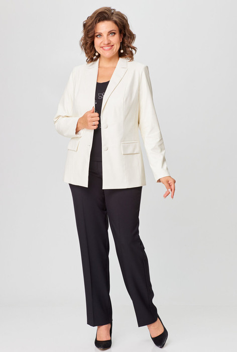 Комплект женский-двойка, жакет удлиненный, из экокожи, полуприлегающего силуэта с центральной бортовой застежкой на пуговицы до линии перегиба лацкана. Спереди рельефные швы от плечевого шва, отрезной бочок и карман с клапаном. Спинка с рельефами от плечевого шва. Рукав втачной, двухшовный. Воротник пиджачного типа. Жакет на подкладке, длина по спинке 67 см, длина рукава 62 см. Брюки прямые, из текстильной ткани, классические, с заутюженными стрелками, по переду обработаны карманы с отрезным бочком, застежка на тесьму-молнию и 1 пуговицу. На задних половинках обработаны вытачки и имитация карманов с листочкой, пояс в брюках притачной. Длина брюк от талии по боковому шву 103 см.