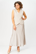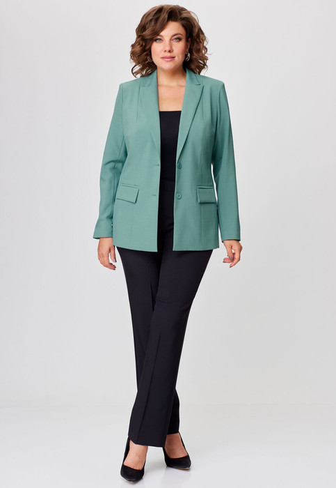 Комплект женский-двойка, из текстильной ткани, жакет удлиненный, полуприлегающего силуэта с центральной бортовой застежкой на пуговицы до линии перегиба лацкана. Спереди рельефные швы от плечевого шва, отрезной бочок и карман с клапаном. Спинка с рельефами от плечевого шва. Рукав втачной, двухшовный. Воротник пиджачного типа. Жакет на подкладке, длина по спинке 67 см, длина рукава 62 см. Брюки прямые, классические, с заутюженными стрелками, по переду обработаны карманы с отрезным бочком, застежка на тесьму-молнию и 1 пуговицу. На задних половинках обработаны вытачки и имитация карманов с листочкой, пояс в брюках притачной, по боковому на резинке.  Длина брюк от талии по боковому шву 103 см.