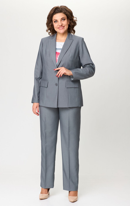 Комплект женский-двойка, из текстильной ткани, жакет удлиненный, полуприлегающего силуэта с центральной бортовой застежкой на пуговицы до линии перегиба лацкана. Спереди рельефные швы от плечевого шва, отрезной бочок и карман с клапаном. Спинка с рельефами от плечевого шва. Рукав втачной, двухшовный. Воротник пиджачного типа. Жакет на подкладке, длина по спинке 67 см, длина рукава 62 см. Брюки прямые, классические, с заутюженными стрелками, по переду обработаны карманы с отрезным бочком, застежка на тесьму-молнию и 1 пуговицу. На задних половинках обработаны вытачки и имитация карманов с листочкой, пояс в брюках притачной. Длина брюк от талии по боковому шву 103 см.