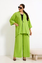 Комплект женский-двойка, из текстильной ткани, жакет удлиненный, полуприлегающего силуэта с центральной бортовой застежкой на пуговицы до линии перегиба лацкана. Спереди рельефные швы от плечевого шва, отрезной бочок и карман с клапаном. Спинка с рельефами от плечевого шва. Рукав втачной, двухшовный. Воротник пиджачного типа. Жакет на подкладке, длина по спинке 67 см, длина рукава 62 см. Брюки прямые, классические, с заутюженными стрелками, по переду обработаны карманы с отрезным бочком, застежка на тесьму-молнию и 1 пуговицу. На задних половинках обработаны вытачки и имитация карманов с листочкой, пояс в брюках притачной, сбоку на резинке. Длина брюк от талии по боковому шву 103 см.