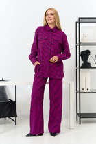Женский комплект 2-х предметный, состоит из жакета и брюк из текстильной ткани. Жакет двубортный, свободного кроя, на подкладке. По переду имеется отрезной бочок и вертикальные вытачки. С прорезными карманами с клапаном и двумя обтачками. Спинка со средним швом. Воротник пиджачного типа. Рукав двухшовный, втачной. Длина рукава 63 см, длина по спинке 74 см. Брюки-палаццо,средней ширины, выполнены с карманами с отрезным бочком в боковом шве. Пояс притачной, застёжка на молнию. По задним половинкам обработаны вытачки. Длина по боковому шву 108 см.