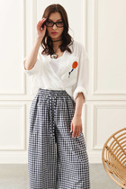 Комплект женский-двойка, состоит из блузы и брюк. Блуза женская, из легкой текстильной ткани. По переду нагрудные вытачки, спинка цельная, в боковых швах по низу разрезы. Спущенное плечо. Длина по спинке в 44-48 размерах 61 см, в 50-54 размерах 62,5,в 56-60 размерах 67 см,в 60-62 размерах 68 см. Классические брюки,из х/б джинса, прямые, слегка заужены к низу, заутюжены стрелки, по переду обработаны карманы с отрезным бочком, застежка на тесьму-молнию и 1 пуговицу. На задних половинках обработаны вытачки и имитация карманов в рамку с двумя обтачками, пояс в брюках притачной. По низу брюк в боковом шве есть небольшой разрез.