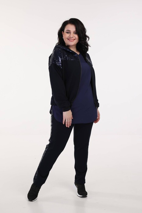 Костюм женский двухпредметный, выполнен из трикотажа с добавлением спандекса в спортивном стиле. Куртка полуприлегающего силуэта со спущенным рукавом, с капюшоном и застежкой молнией спереди. Верх изделия украшен вставками из пайеточной ткани. Манжеты и низ куртки обработаны довязами, функциональные карманы-листочки на полочке. Брюки полуприлегающего силуэта, с резинкой по талии, в боковых швах карманы и лампасы из пайеточной ткани.