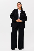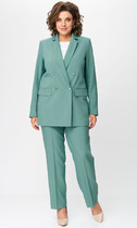 Комплект женский двухпредметный состоит из жакета и брюк выполнен из плотной костюмной ткани в клетку. Жакет полуприлегающего силуэта  с V-образной горловиной, украшенной рюшей, центрально- бортовая застежка на петли и пуговицы, рукав втачной двухшовный с разрезом и рюшей по низу, на полочках накладные карманы. Длина жакета по спинке 72 см, длина рукава 54 см. Брюки классические  с высокой посадкой, полуприлегающего силуэта.  Пояс без резинки, с застежкой молнией на пуговицу. В боковых швах карманы с листочкой. Длина брюк 103 см.