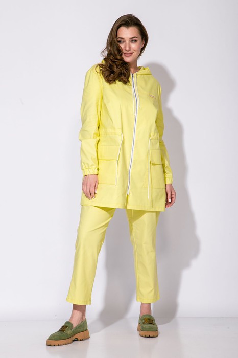 Костюм женский двух предметный свободного силуэта. Состоит из куртки ветровки и брюк. Куртка выполнена из хлопковой ткани без подкладки, с накладными карманами на полочке и кулиской на талии. Рукав вточной с притачным манжетом на резинке по низу. Застежка молния. Брюки с высокой посадкой полуприлегающего силуэта,пояс на резинке. В боковых швах карманы с листочкой. Длина брюк 100 см.