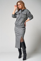 Костюм женский двухпредметный,состоит из жилета и брюк. Жилет на подкладке, с подрезом по талии и функциональными карманами, застежка на петли и пуговицы. Брюки классические  с высокой посадкой, застежка на молнию и пуговицу, в боковых швах карманы. Длина жилета 70 см, длина брюк 103 см.