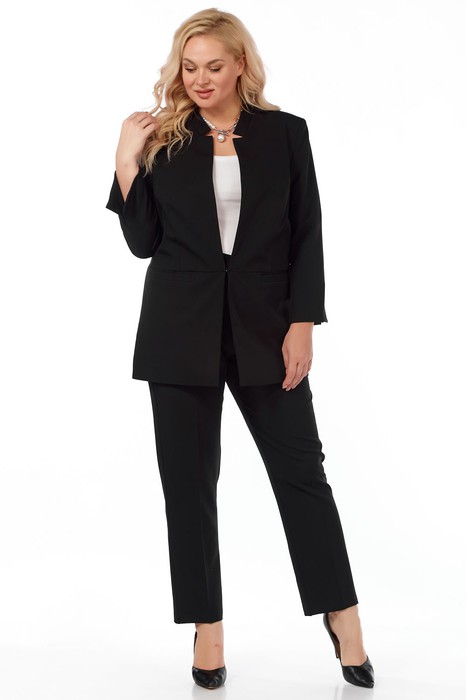 Костюм женский двухпредметный полуприлегающего силуэта, состоит из жакета и брюк. Жакет с декоративным подрезом по переду полочки, рукав втачной 3/4 с разрезом в локтевом шве, без воротника, застежка на крючек, карманы листочки обработаны в подрезе. Брюки на поясе с застежкой молния и пуговица.