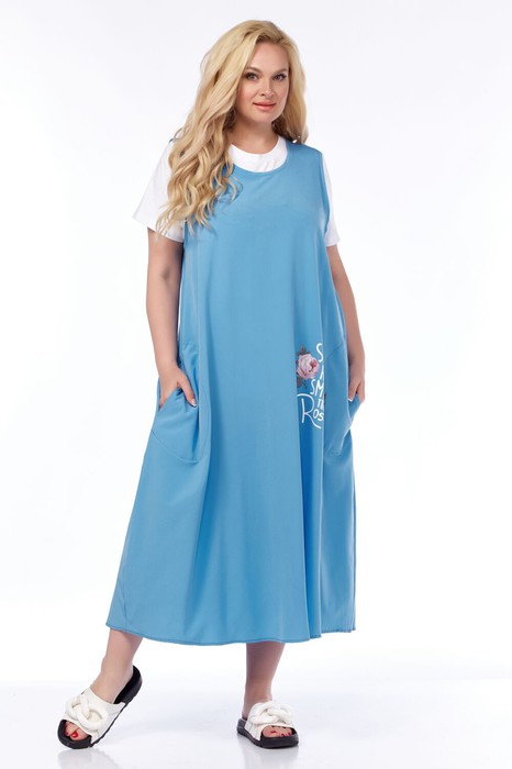 Костюм женский двухпредметный, состоит из футболки и сарафана. Сарафан длинный А-образного силуэта, отстроченные карманы в боковых швах, перед украшен термоаппликацией. Футболка  с разрезами в боковых швах, рукав втачной, короткий.