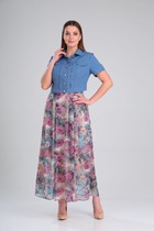 Костюм женский полуприлегающего силуэта, состоит из джемпера и брюк. Джемпер с подрезом по центру переда, с декоративным украшением, рукав втачной 3/4 с резинкой по низу, в боковых швах разрезы. Брюки с застежкой на молнию и пуговицу, в боковых швах карманы.