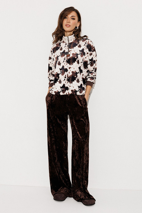 Костюм велюровый 2-ух предметный. Джемпер из принтованного велюра прямого силуэта с втачным рукавом и спущенной линией плеча, с манжетой из довяза по низу рукава. По переду молния и нашивка "BUTER". Воротник-стойка. По низу подгибка со вставленной в него эластичной тесьмой и фиксатором, благодаря которому низ можно затянуть. Брюки из однотонного велюра на цельнокроеном отстроченным поясе со вставленной в него резинкой. Брюки прямого силуэта с карманами в боковых швах.
