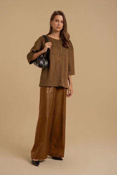 Комплект женский двухпредметный. Блузка свободного покроя из искусственной замши. Вырез горловины - неглубокий, округлой формы. Рукава - втачные со спущенной линией плеча. Изделие декорировано подрезами. Низа с широкой подгибкой и отделочными строчками. Брюки- свободного покроя из искусственной кожи на хлопковой основе. Пояс - отрезной с эластичной тесьмой. в боковых швах имеются карманы с отрезными бочками. Изделие декорировано подрезами.