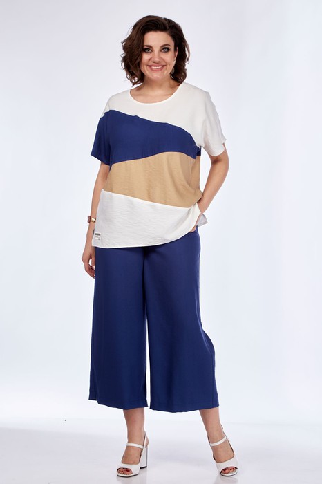 Комплект брючный: блуза+кюлоты. Блуза выполнена из 4-х цветов ткани. Перед и спинка с тремя волнообразными подрезами. Блуза с цельнокройным рукавом со спущенной линией плеча. В боковых швах обработаны разрезы.Брюки- кюлоты с застёжкой "молния" спереди. На  кокетке сзади. Пояс притачной , сзади на резинке.