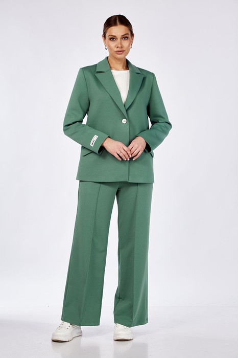 Комплект брючный:кофта +брюки+блузон. Жакет полуприлегающего силуэта с центральной застежкой на петлю и пуговицу. По спинке средний шов со шлицей, прорезные карманы с клапаном и обтачками. Рукав втачной. Воротник стояче-отложной с отрезной стойкой, лацканы с открытыми бртами. Капюшон съемный. Блузон полуприлегающего силуэта, рукав втачной одношовный, короткий. Брюки прямые, верхний срез обработан поясом с резинкой, по переду застрочены стрелки. В качестве отделки используется фурнитура.