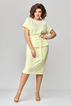 Комплект женский, состоит из платья и жакета. Жакет укроченный свободного кроя с застежкой на 1 петлю и пуговицу. Воротник пиджачного типа с лацканом. Рукав цельнокройный длиной 3/4. Платье полуприлегающего силуэта, чуть расклешенное к низу. Перед с косым подрезом и мягкими складками в области талии. Горловина в виде "качели". Пройма соспущенной линией плеча. Спинка со средним швом и потайной молнией до подреза. В области талии косой подрез.
