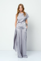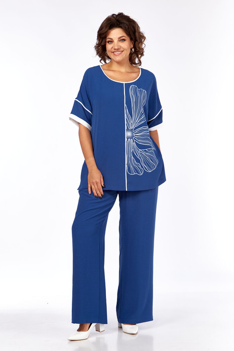 Комплект брючный состоит из блузы и брюк. Блуза прямого кроя со спущенной линией плеча. Перед с кантом из отделочной ткани по среднему шву. Левая часть переда украшена печатью. Спинка со средним швом. Рукав одношовный с кантом по окату и манжетам из отделочной ткани. Горловина округлой формы  с кантом. По бокам обработаны разрезы. Брюки прямые, свобюдного кроя. По боковым швам кант из отделочной ткани и карманы. Пояс притачной, на резинке.