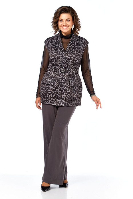 Комплект брючный состоит из жилетки и брюк. Жилетка свободного кроя с потайной застежкой на 3 кнопки. Спинка со средним швом. Перед с боковыми прорезными карманами с клапаном. Воротник пиджачного типа с лацканом. Съемный пояс с пряжкой вставлен в шлёвки по бокам. Брюки широкие, прямого кроя. Задние половинки с 2-мя вытачками. Передние прловинки с 2-мя складками, боковыми карманами и застежкой "молния". Пояс с 5-ю шлевками  сзади и на резинке. В комплекте водолазка из сетки.