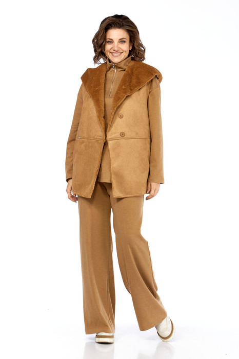 Комплект брючный состоит из кофты, жилетки и брюк. Кофта полуприлегающего силуэта со спущенным плечом, рукав втачной, одношовный. Воротник стойка с застежкой на тесьму-молнию. По боковым швам разрезы. Брюки расширенные книзу, верхний срез обработан поясом с резинкой. В боковых швах карманы. Жилетка свободного кроя со смещенной застежкой на петлю и пуговицу. По спинке горизонтальный рельефный шов на перед, в котором обработаны карманы. Цельнокроенный капюшон с центральной частью. В качестве отделки используется фурнитура.Длина кофты по спинке 69-72 см, длина рукава 54 см. Длина жилетки по спинке 74-80 см. Длина брюк 109-110 см