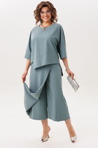 Комплект женский состоит из платья и длинного кардигана со съемным поясом. Платье полуприлегающего силуэта. Спинка со средним швом, перед с подрезом по левому боку, переходящим в разрез с декором из кружева. Рукав втачной одношовный, длиной до локтя. Горловина округлой формы, украшена кружевом. Кардиган с разрезами по бокам. Рукав втачной одношовный с манжетами. По переду притачная бейка. Пояс съемный.