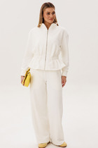 Комплект брючный состоит из кофты и брюк. Кофта свободного кроя покроя реглан. По низу рукава манжет. Капюшон с центральным швом. По боковым швам разрезы. В качестве отделки используется кружево по рукаву и капюшону. Брюки широкие, в боковых швах обработаны карманы. Верхний срез обработан поясом с резинкой.