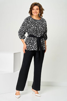 Комплект брючный состоит из рубашки и брюк. Рубашка со спущенным плечом, с застежкой на петли и пуговицы. По спинке кокетка, по шву притачивания нижней части заложена складка, по боковым швам-разрезы. Рукав втачной одношовный короткий. Воротник стояче-отложной с отрезной стойкой. Используются две ткани. Брюки расширенные к низу. На задней половинке-кокетка, обработаны карманы в шве с застежкой на петлю-пуговицу. По переду в рельефном шве бочка обработаны карманы. Застежка на тесьму-молнию, петлю-пуговицу. Верхний срез обработан поясом с резинкой. По поясу-шлёвки. В качестве отделки используется фурнитура, отделочная строчка.