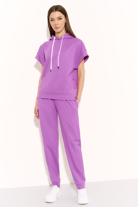 Костюм женский в спортивном стиле изтрикотажного полотна. Жилет свободный, с капюшоном. В кулису капюшона вставлен декоративный шнур. На переде жилета обработан накладной карман кенгуру с обтачными листочками. Низ жилетаобработан притачной планкой. В боковых швах планки с застежкой на кнопки. Брюки прямые с манжетами пояс с эластичной тесьмой с отделочными строчками. В боковых швах карманы.