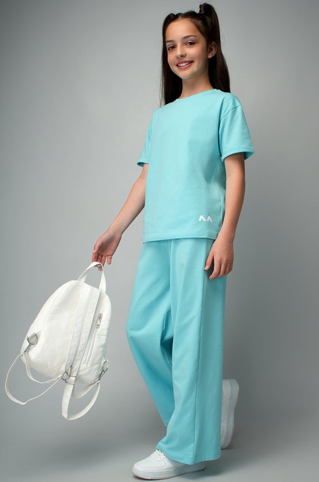 Однотонный голубой костюм идеален для прогулок летом. Подростковый костюм двойка подойдет для отдыха и поездок за город.