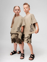 Костюм для мальчика ,состоящий из футболки и брюк. Футболка - из гладкокрашеного полотна "кулирка", классического покроя, с короткими втачными рукавами, горловиной овальной формы, обработанной втачной планкой, и принтом вцентре переда, выполненным в технике шелкографии. Брюки - из полотна с набивным рисунком, прямого силуэта, на притачном поясе с эластичнойтесьмой внутри и карманами в боковых швах, входы в которые окантованы основным материалом.