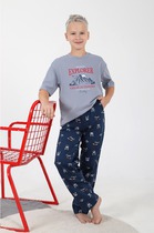 Костюм для мальчика, состоящий из футболки и брюк. Футболка однотонная с принтом на груди; модель свободная, со спущенной линией плеч, втачными короткими рукавами и овальным вырезом горловины. Брюки из полотна с набивным рисунком эксклюзивного дизайна, прямые, с боковыми карманами с обтачными входами, на притачном поясе с отстроченной эластичной тесьмой.