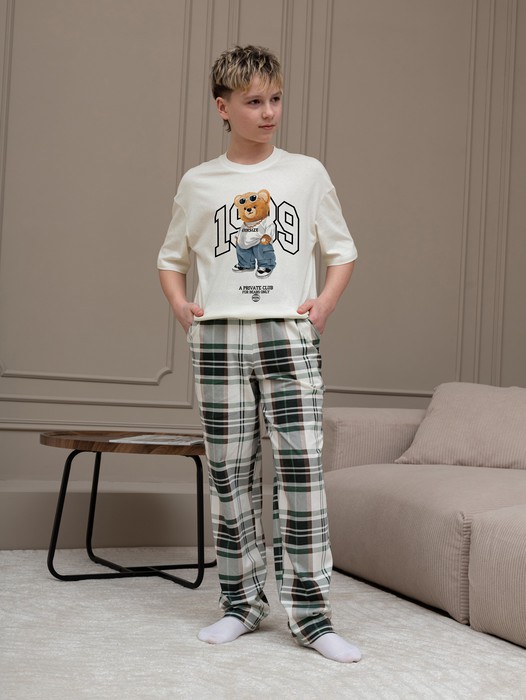 Костюм для мальчика, состоящий из футболки и брюк. Футболка однотонная с принтом на груди; модель свободная, со спущенной линией плеч, втачными короткими рукавами и овальным вырезом горловины. Брюки из полотна с набивным рисунком эксклюзивного дизайна, прямые, с боковыми карманами с обтачными входами, на притачном поясе с отстроченной эластичной тесьмой.