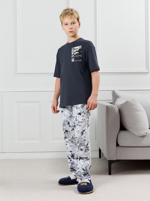 Костюм для мальчика, состоящий из футболки и брюк. Футболка однотонная с принтом на груди; модель свободная, со спущенной линией плеч, овальным вырезом горловины. Брюки из полотна с набивным рисунком эксклюзивного дизайна, прямые, с боковыми карманами с обтачными входами, на притачном поясе с отстроченной эластичной тесьмой.