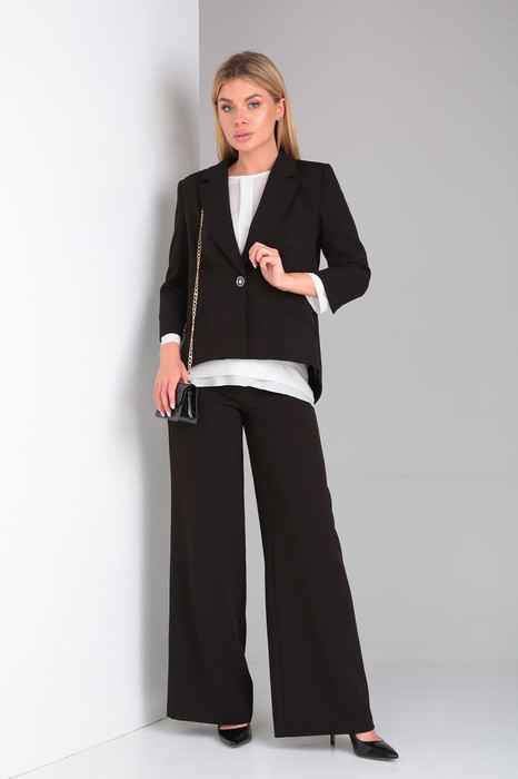 Элегантный брючный костюм в комплекте с шифоновой блузкой.Жакет полуприлегающего силуэта с воротником и лацканами классической формы, застежкой на 1 пуговицу. Особое внимание заслуживает экстравагантная спинка с имитацией запаха и серебристыми металлическими акцентами в виде цепочек, соединяющих две половинки отлетной спинки.Брюки прямого покроя расширены от линии бедра. Комфортная посадка брюк и подчеркивающий фигуру крой сделает их любимым предметом вашего гардероба.Костюм выполнен из материала модных цветов, не требующего особого ухода, пластичен и удобен в носке.Блузка-туника нежного молочного пастельного оттенка с шифоновыми рукавами. Блуза очаровывает своим красивым непринужденным полуприлегающим силуэтом, фигурной линией низа, и конечно же спинкой.Фантазийная спинка с шифоновыми вставками и воланами, красиво драпирующимися и являющимися одним из популярных трендов, шикарно смотрится как самостоятельно, так и в сочетании с эффектным разрезом на жакете.