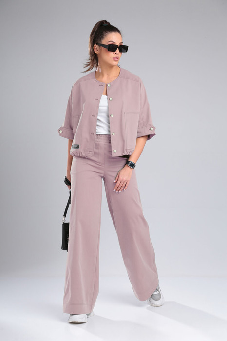 Стильный костюм из джинсовой ткани с отстрочкой. Укороченный жакет  свободного силуэта, рукав цельнокройный с манжетой и декоративным хлястиком, по полочке настрочные карманы с боковым входом, по низу регул. кулиска. Застежка на петли и пробивные пуговицы. Брюки свободного силуэта расклешенные от бедра,  с боковыми карманами, посадка средняя,  пояс на резинке.