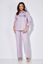 Такой наряд придаст образу нотку яркости и уверенности. Женственный элегантный 3-х предметный комплект состоит из жакета, блузы и брюк. Жакет полуприлегающего силуэта с центральной бортовой застежкой на петли-пуговицы, передние полочки обработаны подкладкой. Вырез V-образной формы. Рукав втачной, полной длины. Спинка со средним швом. Блуза прямого силуэта с нагрудными вытачками, со спущенной линией плеча в боковых швах небольшие разрезы. Брюки с заутюженными стрелками слегка зауженные к низу. Пояс притачной, частично на резинке. Застежка на тесьму-молнию и пуговицу. Украшением является объемный, красивый цветок ручной работы (цветок съемный)