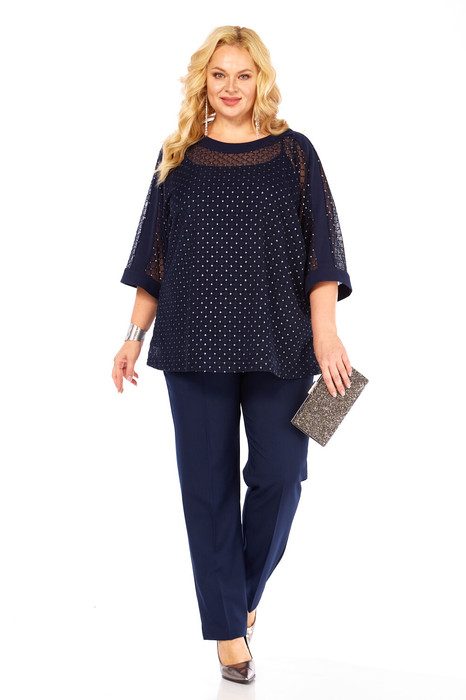 Костюм предназначен для элегантных женщин. Состоит из 3-х предметов блузки, топа и брюк,. Праздничная элегантная блузка полуприлегающего силуэта, выглядит эффектно, прекрасно подойдет для вечерних мероприятий. Горловина аккуратной округлой формы. Рукав втачной, свободный, длина 7/8. В боковых швах предусмотрены разрезы. Топ входит в комплект. Брюки классические с заутюженными стрелками, слегка зауженные к низу, оформлены притачным поясом, частично на резинке. Застежка спереди брюк на молнию и петлю-пуговицу.