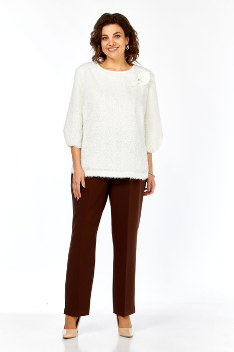 Комплект женский брючный 2-х предметный. Праздничная элегантная блузка полуприлегающего силуэта, выглядит эффектно, прекрасно подойдет для мероприятий. Горловина аккуратной округлой формы. Рукав втачной, свободный с фантазийным решение, длина 7/8. Декоративным элементом является съемная дизайнерская брошь. Средний шов спинки вверху переходит в застежку на 6 навесных петель, пуговиц. В боковых швах предусмотрены разрезы. Брюки классические с заутюженными стрелками, слегка зауженные к низу, оформлены притачным поясом, частично на резинке. Застежка спереди брюк на молнию и петлю-пуговицу