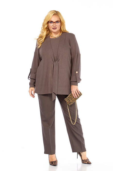 Женственный комплект способен создать уютный образ,  стильная вещь, которая отлично подходит для создания комфорта. Состоит из трех изделий лонгслив, джемпер (выполнен из мягкого трикотажа) и брюки. Вырез горловины V-образной формы, дополнен завязками, что является акцентом данного образа. Рукав втачной, со спущенной линией плеча, низ на манжете с застежкой на пату. В боковых швах предусмотрены разрезы. Джемпер идеально подойдет для демисезонного периода, а также для прохладных вечеров. Брюки слегка зауженные к низу. Пояс притачной, частично на резинке. Застежка спереди на тесьму-молнию, петлю-пуговицу