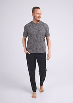 Костюм мужской футболка и шорты. Футболка из кулирного полотна, свободная, прямого силуэта, с принтом. Втачной короткий рукав. Горловина круглая, обработана узким воротником. Плечо и горловина спинки усилены тесьмой. Шорты из футера с лайкрой - свободные, с притачным поясом и карманами. Низ - подгибка.