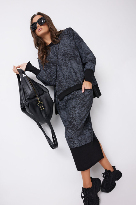 Комплект женский, состоящий из юбки и джемпера. Джемпер прямого силуэта, по переду вытачки, рельефы и разрезы в них. Горловина круглой формы с притачной планкой, рукав покроя реглан заканчивающейся манжетой с разрезом. По низу переда и спинки притачные планки. Низ разноуровневый. По переду джемпера декор с фирменным логотипом. Юбка прямого силуэта. Заднее полотнище с подрезом, переднее с боковыми объемными карманами. Пояс притачной с резинкой по кругу, по низу притачная планка с разрезом на заднем полотнище. В швах проймы переда, спинки и подреза заднего полотнища юбки, так же в карманах планки с открытыми срезами.