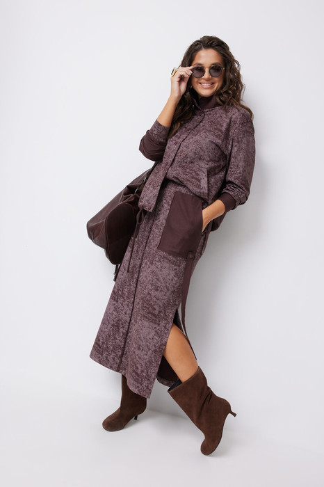 Комплект женский состоящий из бомбера и юбки. Бомбер прямого силуэта со спущенной линией плеча, на притачной манжете. Воротник-стойка, перед с центральной бортовой застежкой на кнопки и боковыми карманами ввиде листочки с втачными концами. Низ бомбера выполнен ввиде кулисы. Спинка с декоративным настрочным элементом. Юбка прямого силуэта с притачным поясом на резинке и разрезами в боковых швах. Перед со средним швом. Перед и спинка с накладными фигурными карманами. Бомбер и юбка с отделочными элементами ввиде тесьмы из основной ткани, пристегивающиеся на кнопку. Край борта, воротник, средний шов и карманы юбки выполнены с открытым срезом.