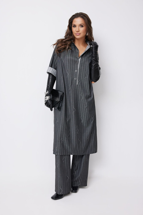 Комплект женский, состоящий из туники и брюк. Туника прямого силуэта, по переду планка-поло с застежкой на декоративные кнопки. Воротник рубашечного типа, рукав втачной длинной 3/4. В боковых швах высокие разрезы. Брюки прямого силуэта, передняя часть с боковыми карманами, задняя часть с вытачками.  Застежка на молнию, петлю пуговицу, пояс притачной со шлевками и резинкой по боковой и задней частям. В комплекте используется двухлицевая ткань, что позволяет регулировать длину рукава.