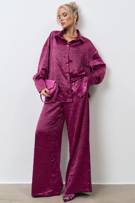 Рубашка свободного кроя и широкие брюки создают ощущение лёгкости и комфорта, при этом силуэт остаётся элегантным.