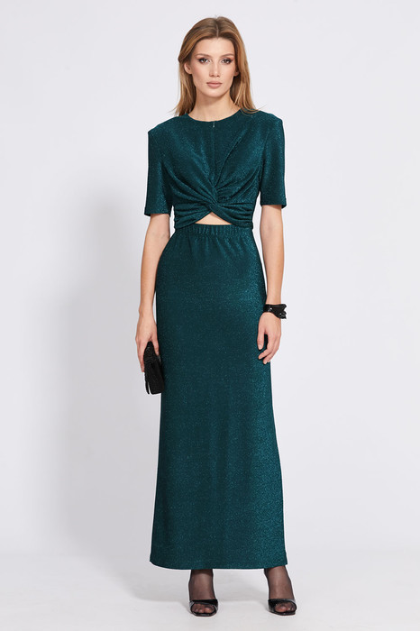 Комплект: блузка + юбка. Комплект выполнен из трикотажного полотна с люрексом. Блузка приталенного силуэта длиной до линии талии. Спереди средний шов с застежкой на потайную молнию, перекрут со сборками по боковыми швам. Спинка цельная. Рукав втачной одношовный, длиной до линии локтя. Блузка с плечевыми накладками, на подкладке. Юбка длиной макси, зауженная к низу. Переднее и заднее полотнища цельные. В левом боковом шве разрез. Юбка на цельнокроеном поясе. Юбка без подкладки.
