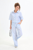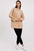 Костюм свободного прилегания выполнен из мягкой немнущейся ткани. Блузон с капюшоном и цельнокроеным рукавом по низу которого кулиса с завязками. По полочки блузона выполнен карманы "рамки", низ блузона затягивается на кулису. Брюки- шаровары на притачном поясе с резинкой, по боковым брюк карманы. низ брюк на кулисе. Декорированы брюки густой дизайнерской вышивкой "кошка" Длина брюк 100 см. длина блузона-62 см.