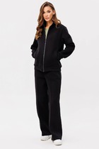 Костюм свободного прилегания выполнен из мягкой немнущейся ткани. Блузон с капюшоном и цельнокроеным рукавом по низу которого кулиска с завязками. По полочки блузона выполнен карманы "рамки", низ блузона затягивается на кулиску. Брюки- шаровары на притачном поясе с резинкой, по боковым брюк карманы. низ брюк на кулиске. Декорированы брюки густой дизайнерской вышивкой "кошка" Длина брюк 100 см. длина блузона-62 см