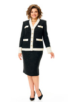 Костюм женский выполнен из льна-вишера. Костюм состоит из брюк и блузона. Брюки зауженные к низу на притачном поясе с резинкой. В боковых швах имеются функциональные карманы. Блузон из ткани в полоску с асимметричной молнией по переду. Горловина - асимметричная. Рукав – приспущенный с манжетам по низу. Спинка с кокеткой и складкой. Низ – асимметричный