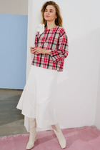 Костюм женский 2х предметный состоит из жакета и брюк. Жакет прилегающего кроя, по полочке жакета расположены прорезные карманы с клапанами. Горловина - отложной воротник с лацканами. Рукав втачной длинный. Застежка петля-пуговица. Брюки прямого кроя с высокой посадкой, на притачном поясе со вставками эластичной тесьмы. в боковых швах брюк -палаццо имеются карманы. Застежка молния на гульфике, петля-пуговица. Жакет без подкладки.