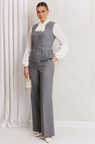 Костюм женский 2х предметный состоит из топа и брюк, выполнен из сочетания легкой струящейся ткани и сетки. Топ свободного кроя, ассиметричный , по полочке расположены нагрудные выточки, брюки на притачном поясе с резинкой, по передним полотнищам брюк расположены вставки из полупрозрачной сетки.