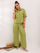 Костюм 3-х предметный, состоит их рубашки, юбки, галстука. Выполнен из костюмной ткани. Рубашка прямого кроя без подкладки, по полочке расположены накладные декоративные элементы и карманы с клапаном. спинка с отрезной кокеткой и таллиевыми выточками. Воротник отложной на стойке, рукав втачной 7/8. Юбка изделия на притачном поясе с резинкой, застежка потайная молния, по низу юбки расположена шлица, юбка с подкладкой.